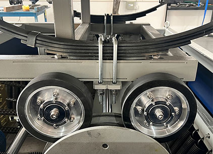 運輸臺的結構簡圖如上圖所示,全部質量通過兩側掛簧吊在框架上,工作臺面由四組板簧與八個膠輪彈性連接,每對膠輪座落在鼓輪上,使臺面處于穩定平衡狀態,鼓輪上對稱裝有不同的兩個相隔180°的可調凸塊,左右兩側鼓輪為差速,沙箱作為可調重量以改變振動系統的頻率特性,驅動電機經減速器鏈傳動機構,帶動鼓輪旋轉并頂起膠輪并使臺面運動,凸塊高度的調節靠專用工具來完成。